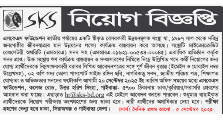 এসকেএস (SKS) ফাউন্ডেশন এনজিও নিয়োগ বিজ্ঞপ্তি ২০২৫, SKS Foundation NGO Job Circular